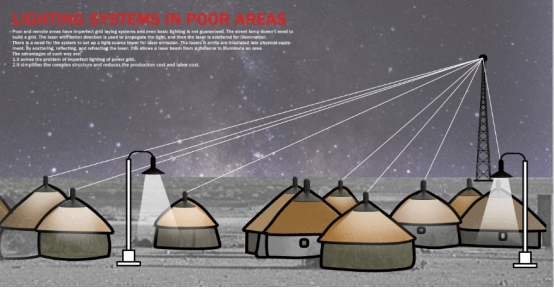 该设计聚焦于地球上缺乏电网的覆盖贫穷和偏远地区,这些地方往往连基本的电力和街道照明也得不到保证。本系统由一个中央发射塔将激光束远距离照射到各个路灯上,路灯将光线反射、折射、散射后,用于街道或室内照明,从而减少受经济、技术等影响的电网铺设控制等环节,并且能减少资源浪费和环境破坏。