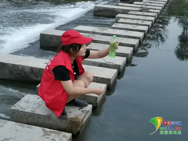 调研团成员在对金堤河河水进行取样调查。