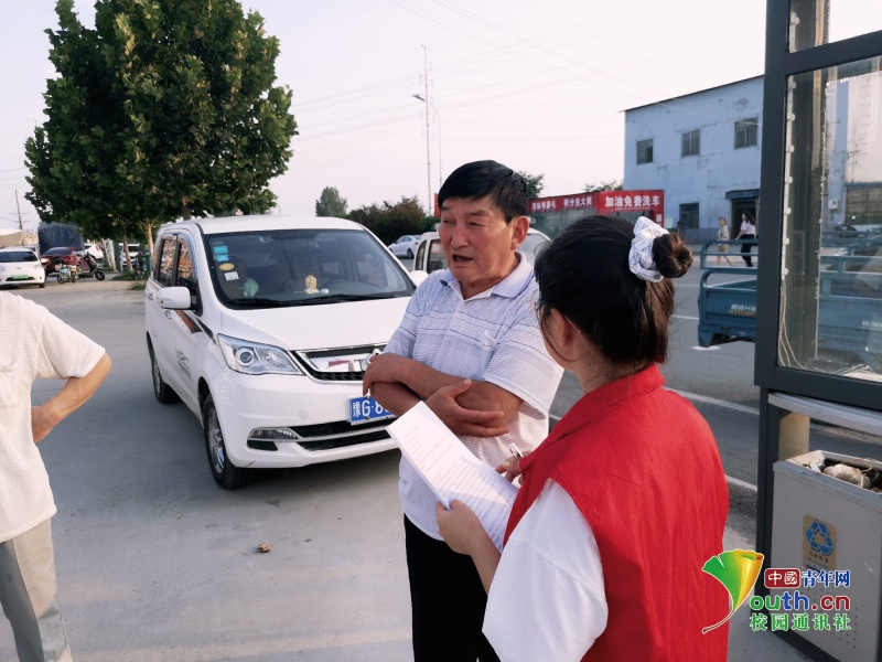 图为志愿者在街边采访路人,对于河长制,路人表示这个政策很好,但落实上还不是很到位。