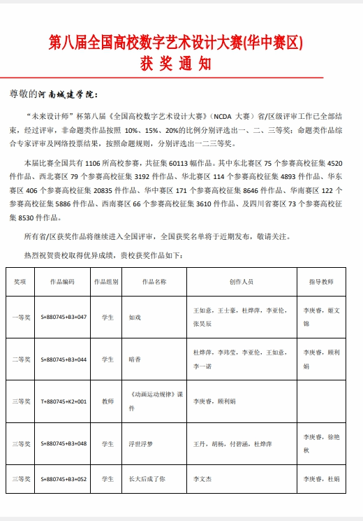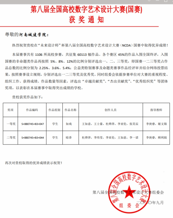 近日获悉公司师生在2020全国高校数字艺术设计大赛(NCDA大赛)中获得佳绩。新葡的京集团350vip动画专业教师顾利娟、姬文锦、徐艳秋、李庚睿、杜娟,员工王如意、王士豪、杜烨萍、张昊辰、李文杰等在华中赛区荣获5项单项奖,其中作品《如戏》《暗香》入选国赛并分别获得国赛一、二等奖。